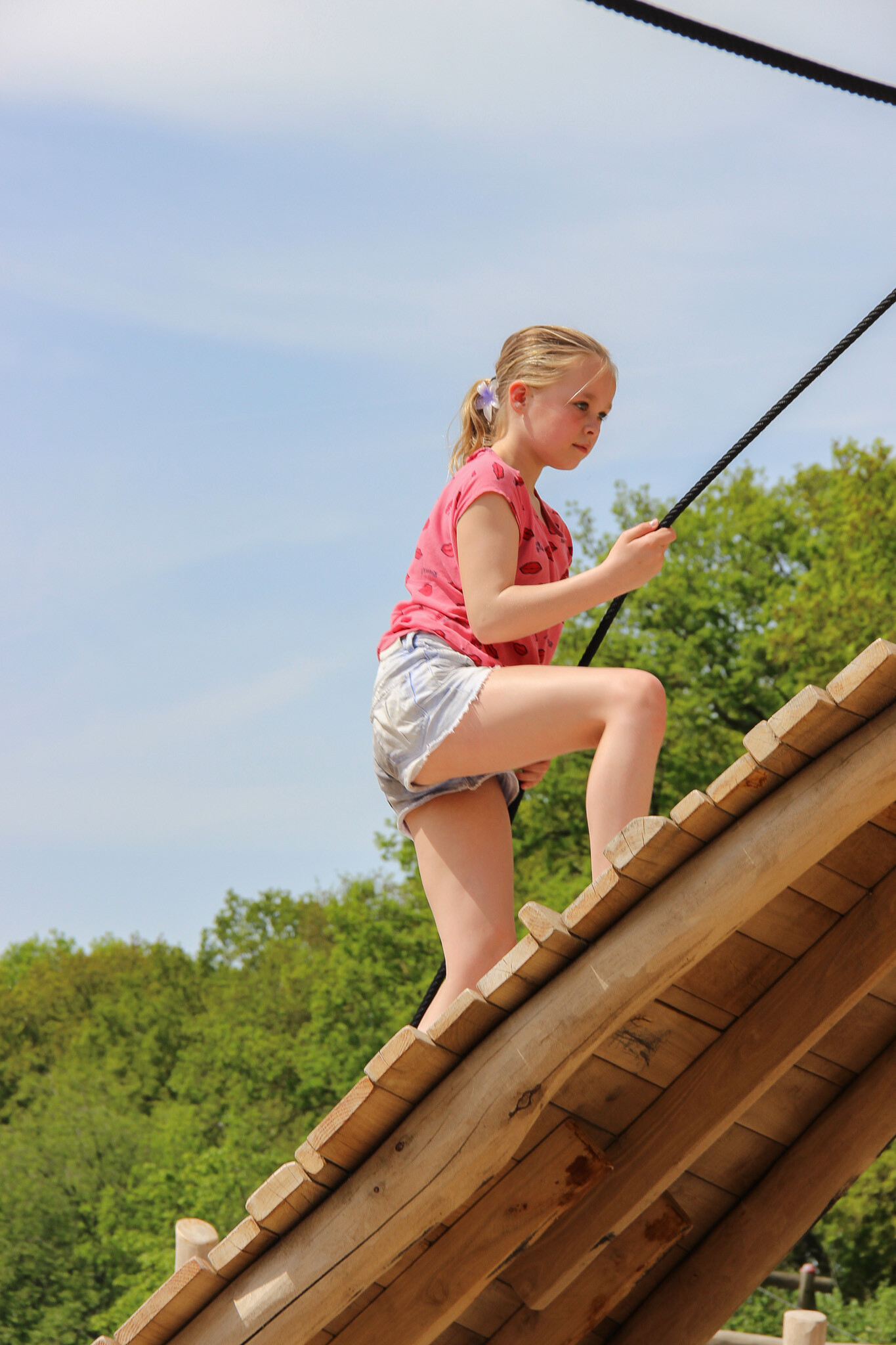Wellicht is dit wel ons meest indrukwekkende speeltoestel, of op zijn minst een van de meest opvallende. Met zijn imposante hoogte van 6 meter maakt het meteen een statement. Kinderen hebben verschillende mogelijkheden om de speeltoren te beklimmen: denk aan de klimwand, één van de trappen, het klimnet of de balanceerstructuur aan de zijkant. Eenmaal bovenop kunnen ze via de brug oversteken, door het raampje van de hoge toren gluren en vervolgens weer afdalen via de robuuste RVS-glijbaan. Dit speeltoestel biedt een schat aan mogelijkheden en uitdagingen.