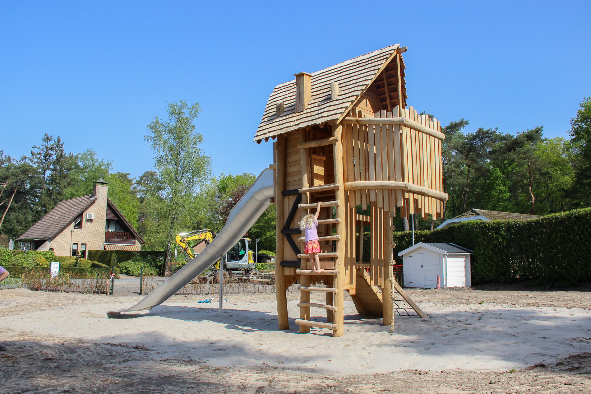 Alle speeltoestellen zijn vervaardigd uit robinia hout, een robuuste houtsoort die goed bestand is tegen intensief gebruik en perfect past in de natuurlijke omgeving van de camping. De toestellen zijn afgewerkt met donkere details, wat zorgt voor een unieke en aantrekkelijke uitstraling. Bovendien hebben we gezorgd voor personalisatie: de grotere speeltoren draagt de naam 't Jagersnest, en op het speelhuis staat 't Pakhuys. Deze namen kunnen uiteraard op maat worden aangepast zodat ze perfect passen bij uw camping of vakantiepark.