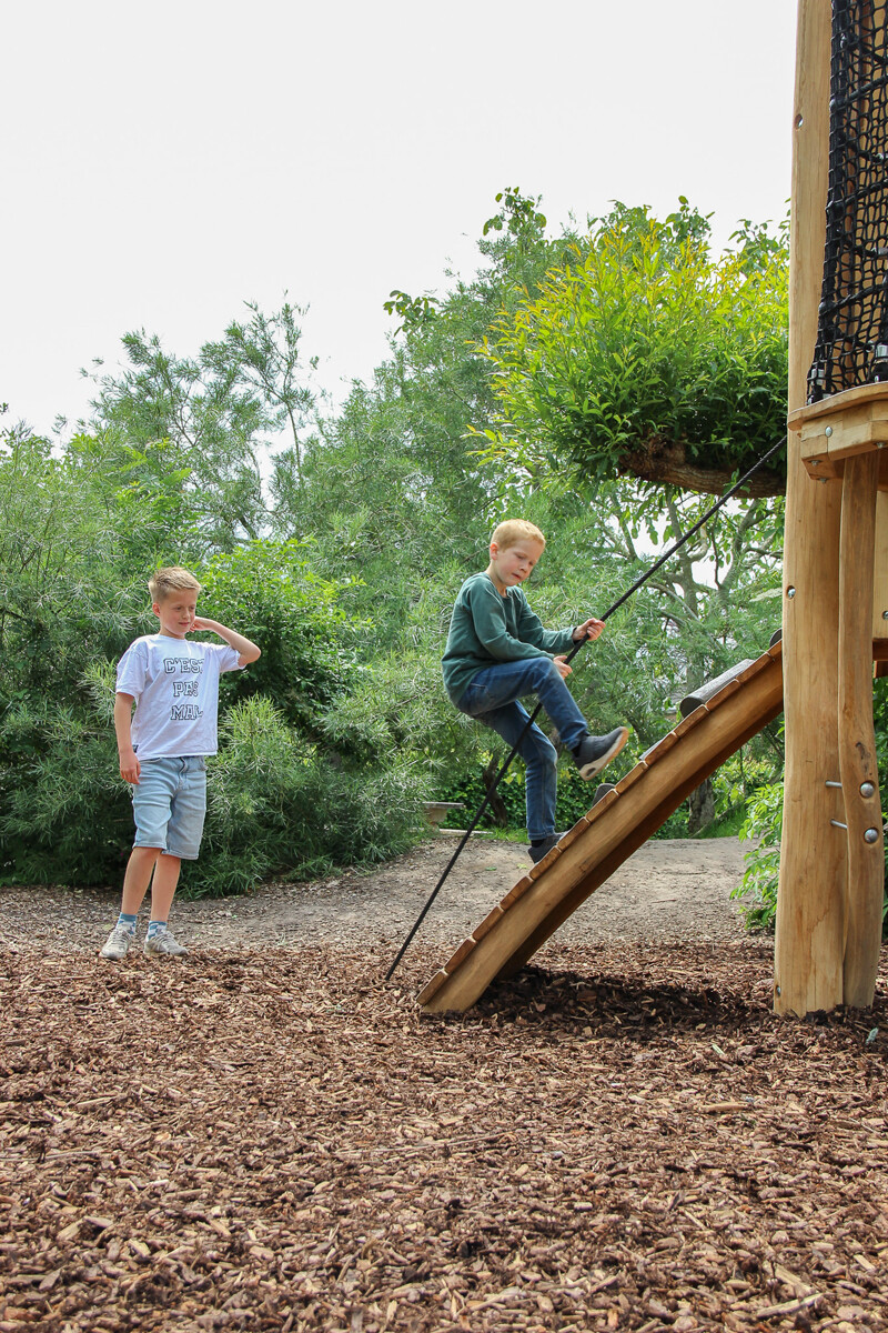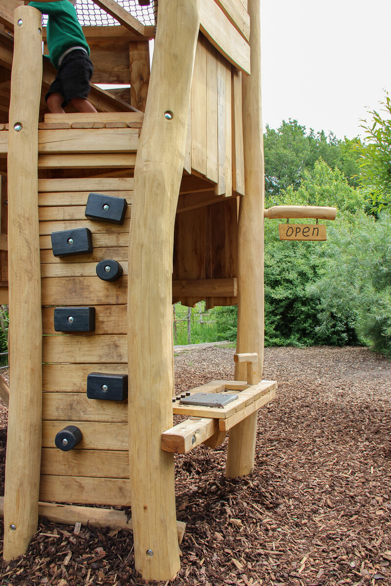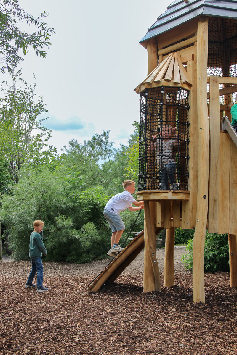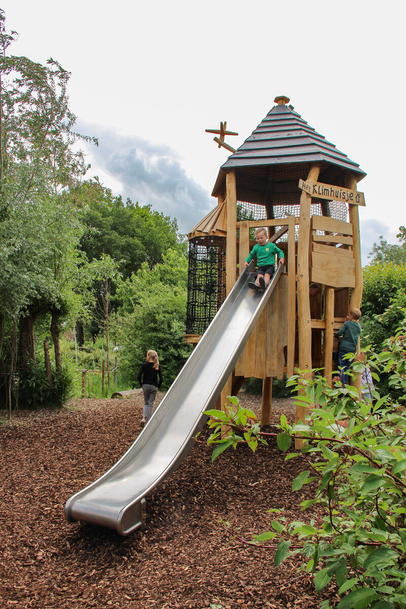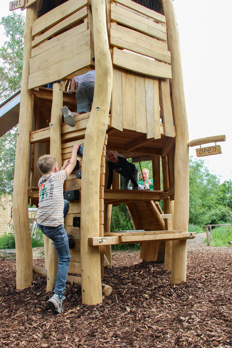 De speeltoren biedt volop speelmogelijkheden voor verschillende leeftijden. Kinderen kunnen: