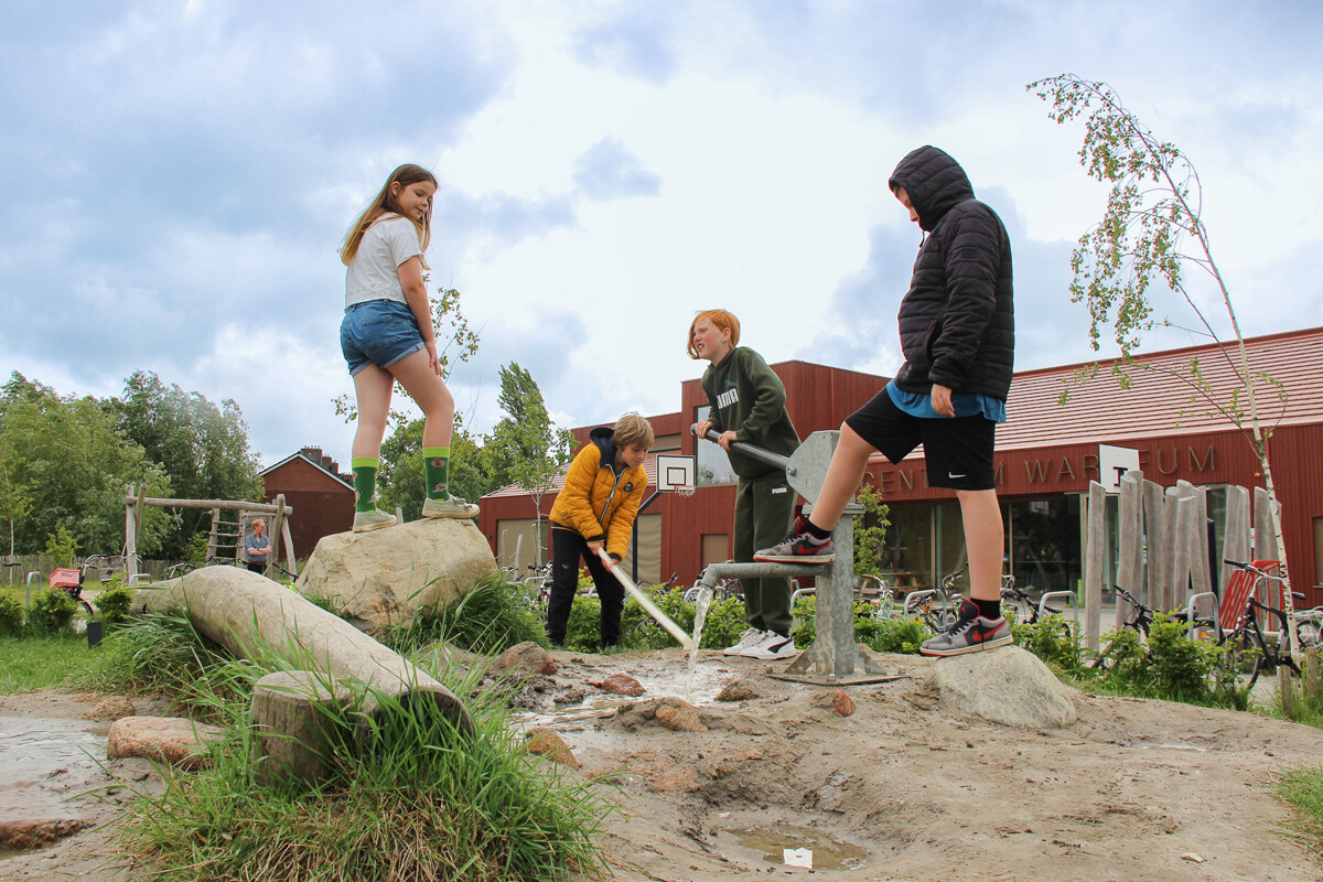 Ook is er op dit groene schoolplein een natuurlijke waterbaan te vinden. Met een waterpomp, stenen en gootjes kunnen kinderen zich uitstekend vermaken, elke pauze weer. De bestaande zandbak heeft nu een schaduwdoek met robiniahouten staanders, zodat er ook op zonnige dagen comfortabel gespeeld kan worden.