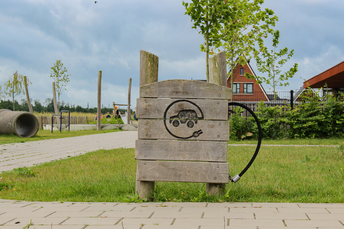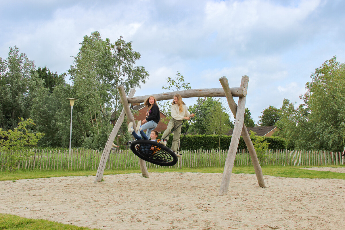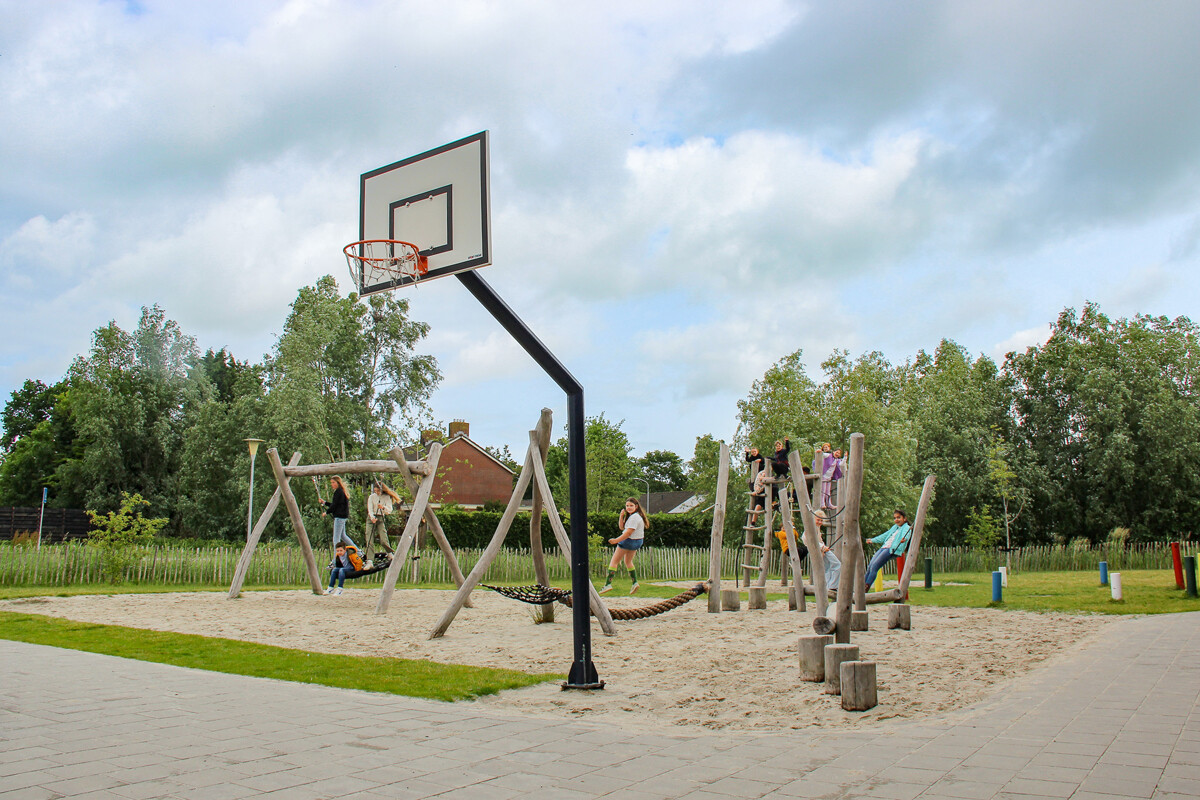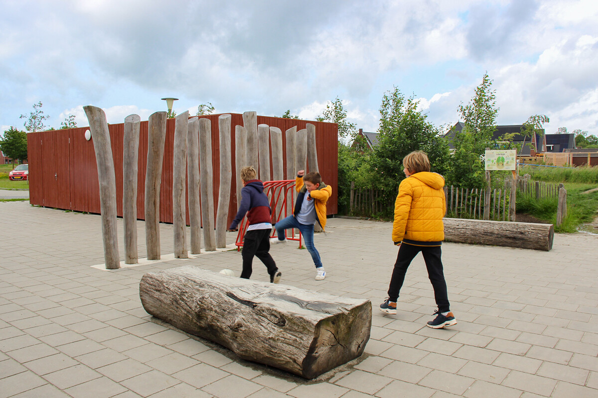 Op het sportveld zorgen ballenvangers voor een veilige omgeving om te voetballen. Ook de ballenvangers zijn van robiniahout, zo passen deze perfect bij de natuurlijke uitstraling. Rondom het pannaveld liggen afgevlakte eiken boomstammen, die zowel als zitplek als speelelement dienen.