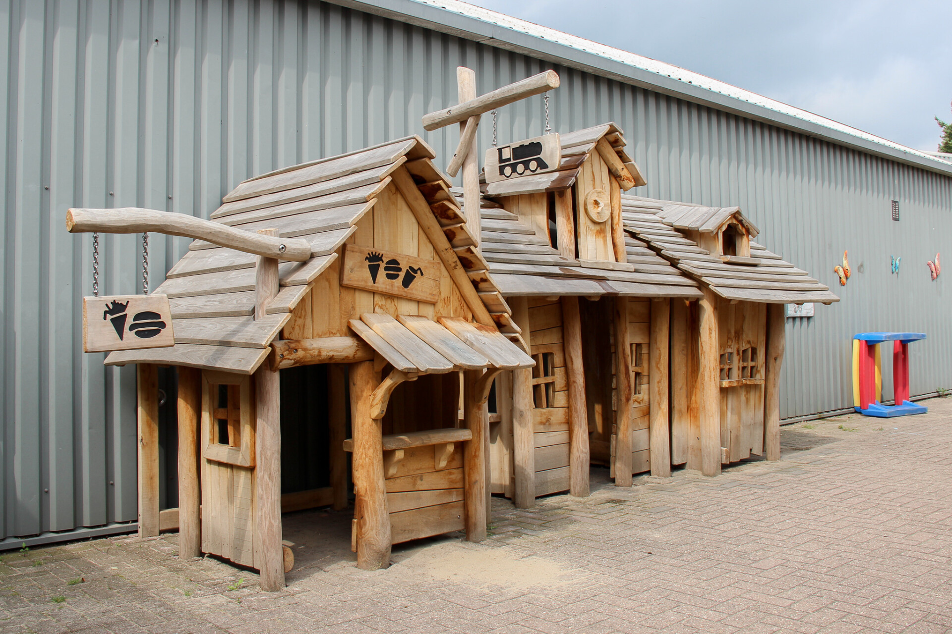Op een ander gedeelte van de buitenruimte staat een unieke gevelrij van speelhuisjes. De kinderen kunnen zich vermaken met in totaal drie speelhuizen. Ook dit speeltoestel is gemaakt van robiniahout en voorzien van leuke details. Zo is het speeltoestel gepersonaliseerd doordat het logo van het kinderdagverblijf is gegraveerd in het hout. Daarnaast geven verschillende gravering zoals de ijsjes boven het loket en het uithangbord het speeltoestel extra uitstraling!