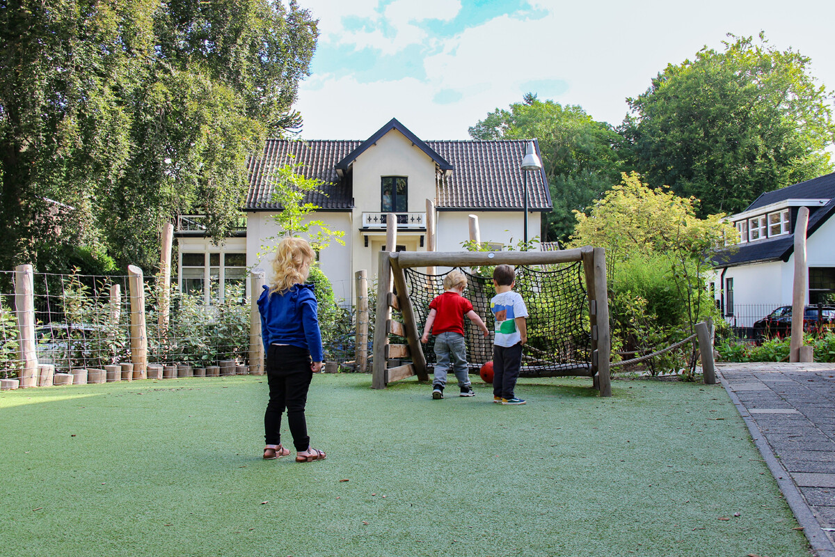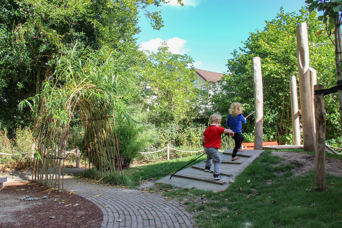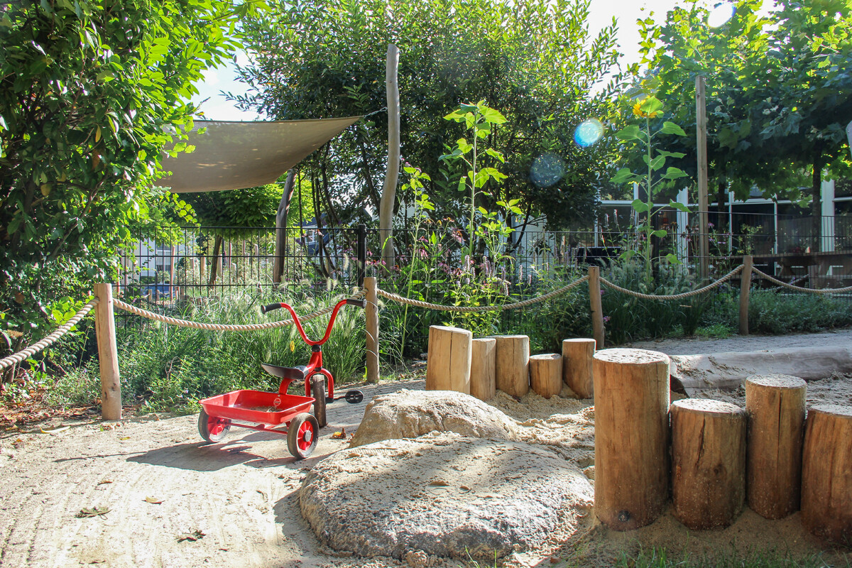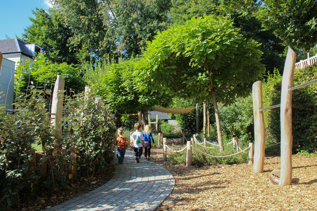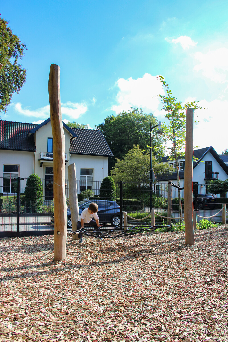 Het vele groen, de veldkeien en de beplanting geven de buitenruimte een natuurlijke uitstraling. De gekozen materialen, zoals robiniahout, zijn duurzaam. Ook passen deze ook nog eens heel goed in een kindvriendelijke omgeving. Dankzij de indeling in twee zones kunnen de jongste kinderen veilig ontdekken, terwijl oudere kinderen meer uitdaging vinden. De speelruimtes spelen in op de ontwikkelingsgebieden van de kinderen.