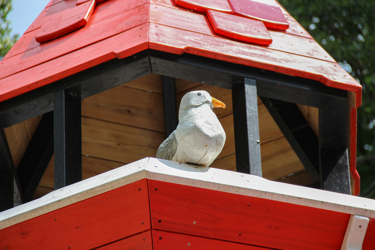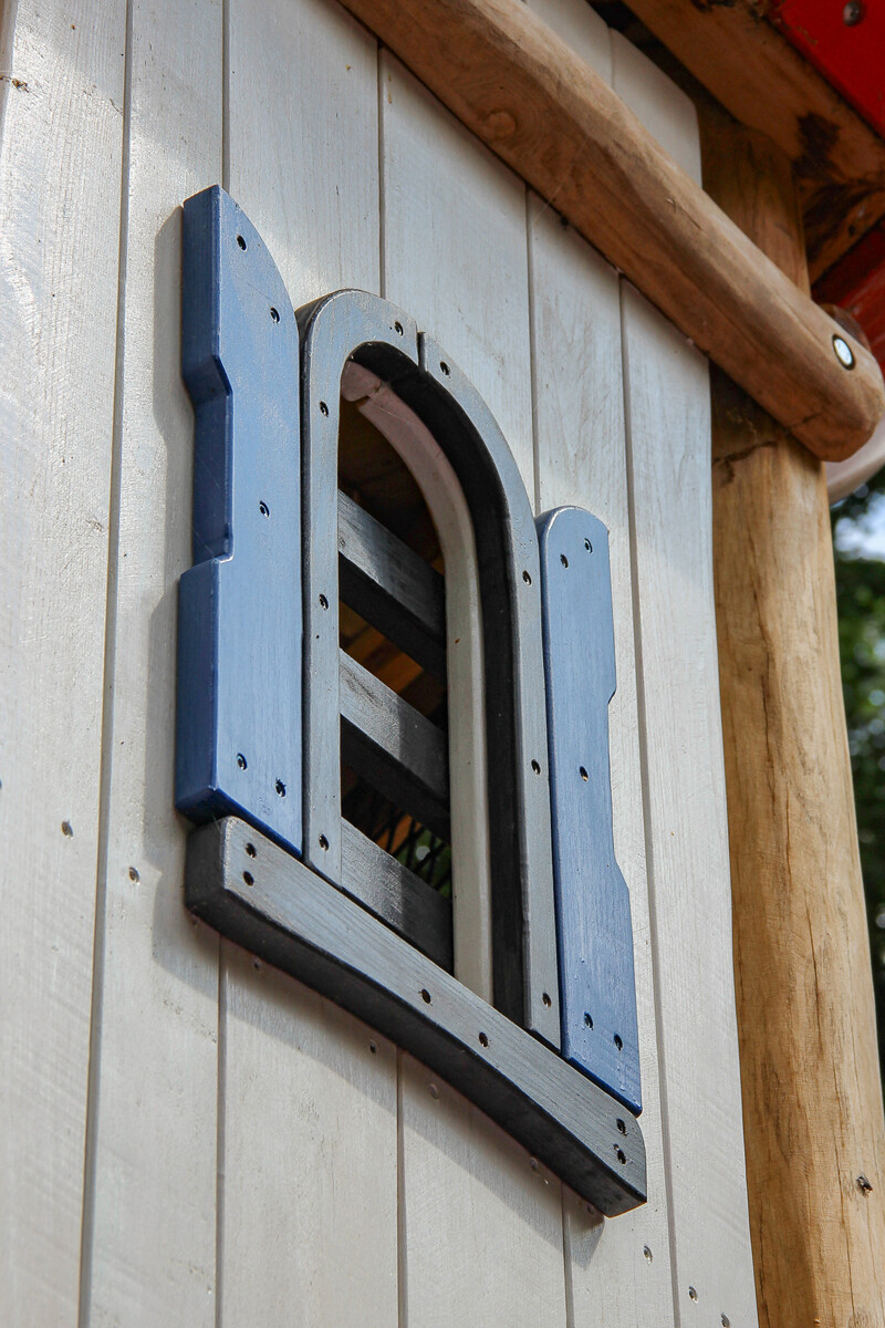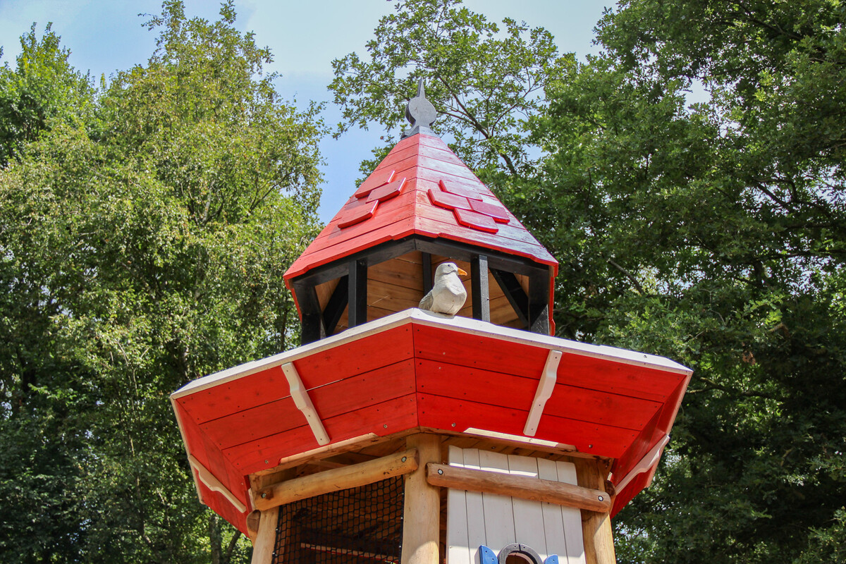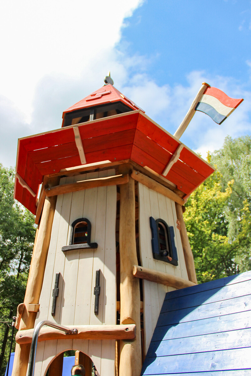 Het dak van het speeltoestel is een echte blikvanger. Door de speelse vorm, de details en kleur voegt het echt iets extra’s toe aan het ontwerp. Het uithangbord, d vlag en de sculptuur van een meeuw maken het plaatje compleet. Zo voelt het alsof je midden in een levendig havendorp staat, vlak bij de zee.