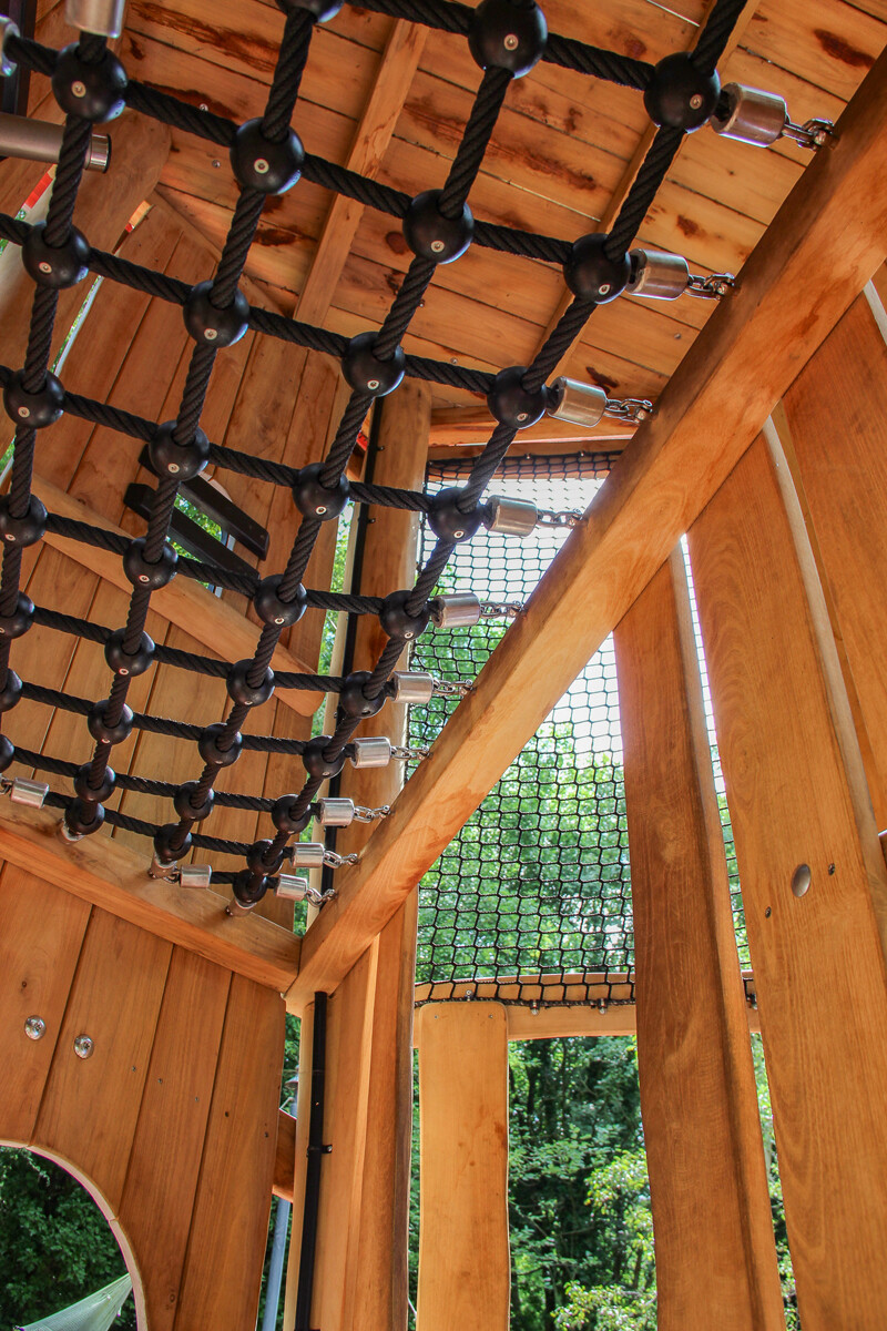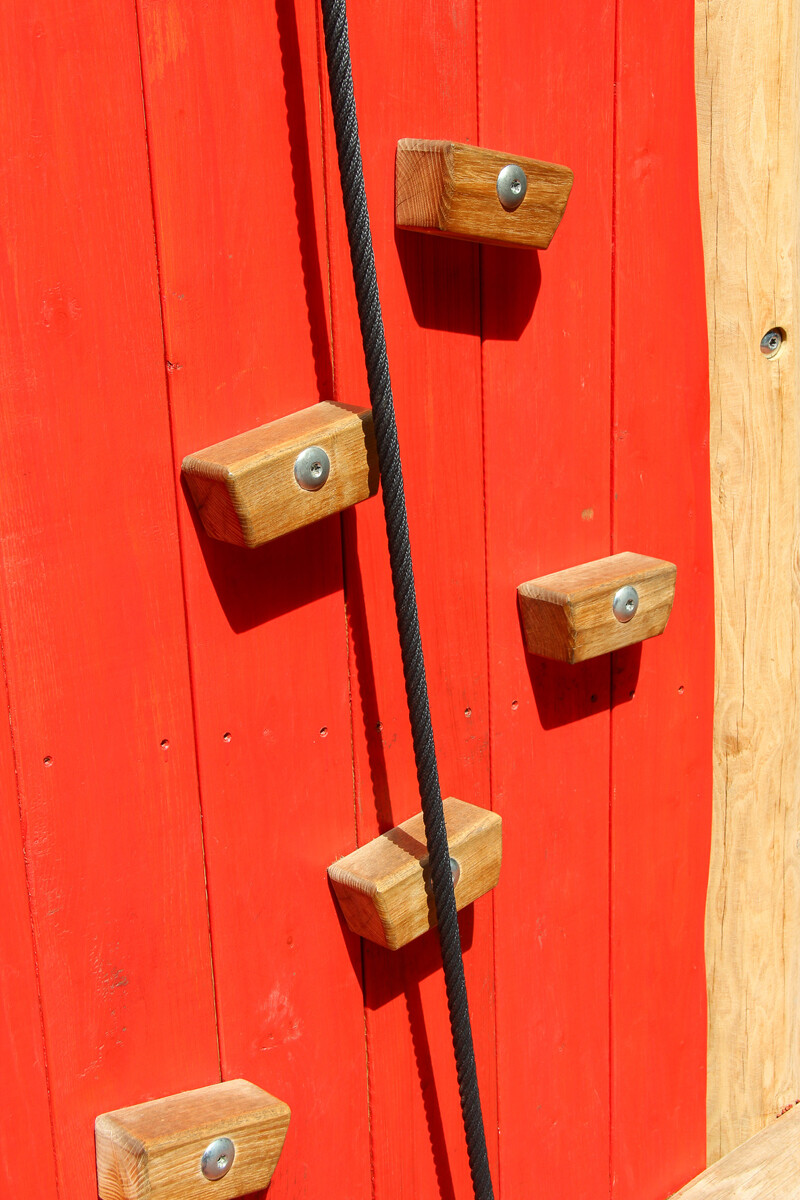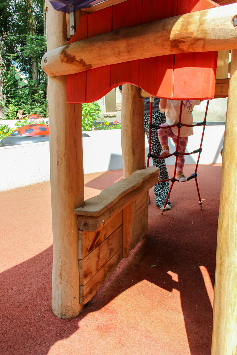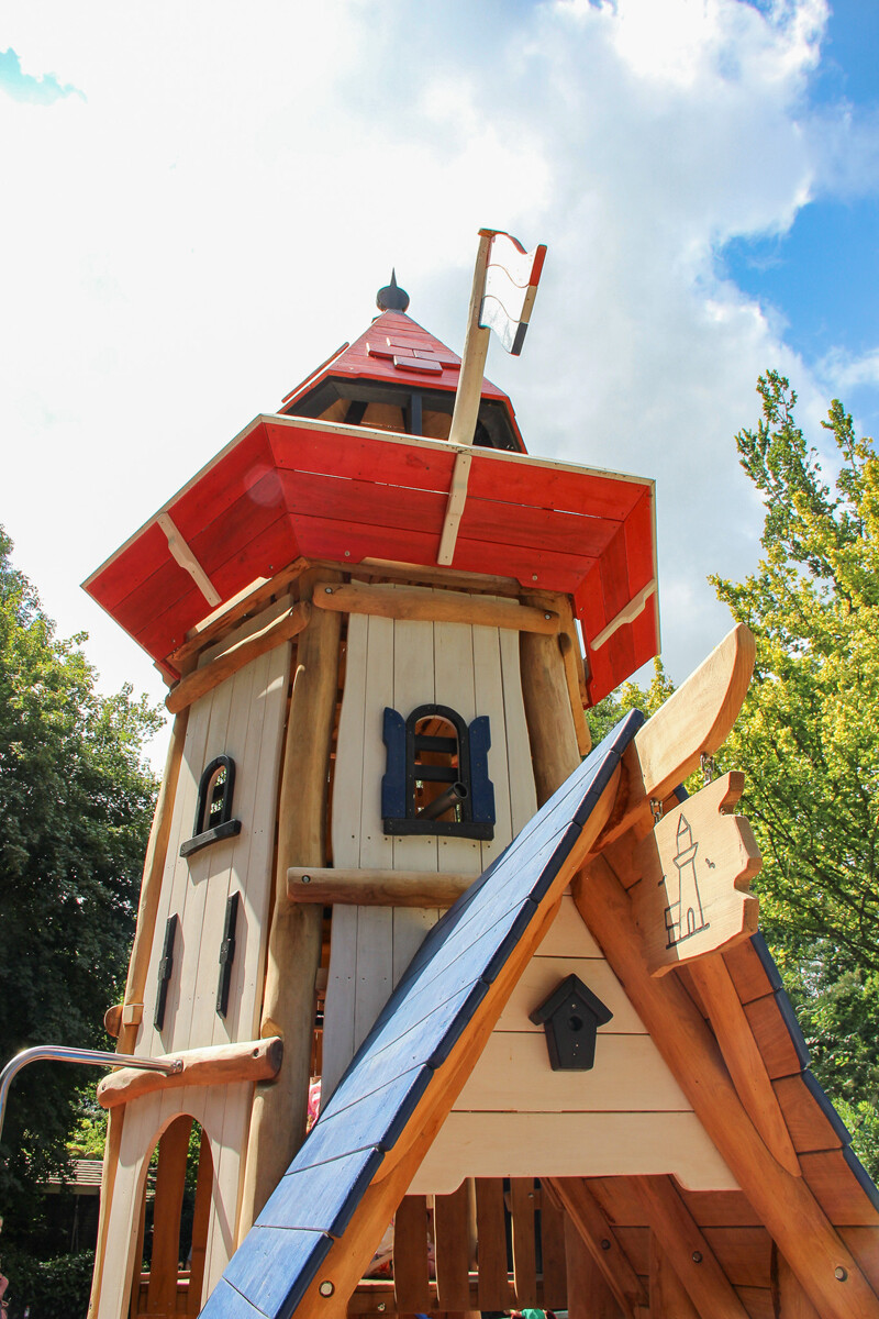 Het dak van het speeltoestel is een echte blikvanger. Door de speelse vorm, de details en kleur voegt het echt iets extra’s toe aan het ontwerp. Het uithangbord, d vlag en de sculptuur van een meeuw maken het plaatje compleet. Zo voelt het alsof je midden in een levendig havendorp staat, vlak bij de zee.