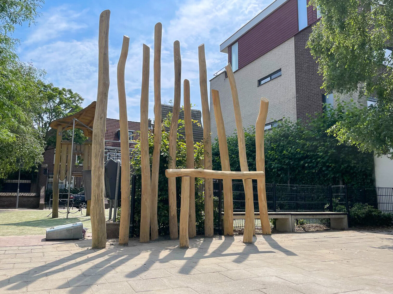- Natuurlijke uitstraling door robuuste robiniahouten palen die passen bij een groen schoolplein;